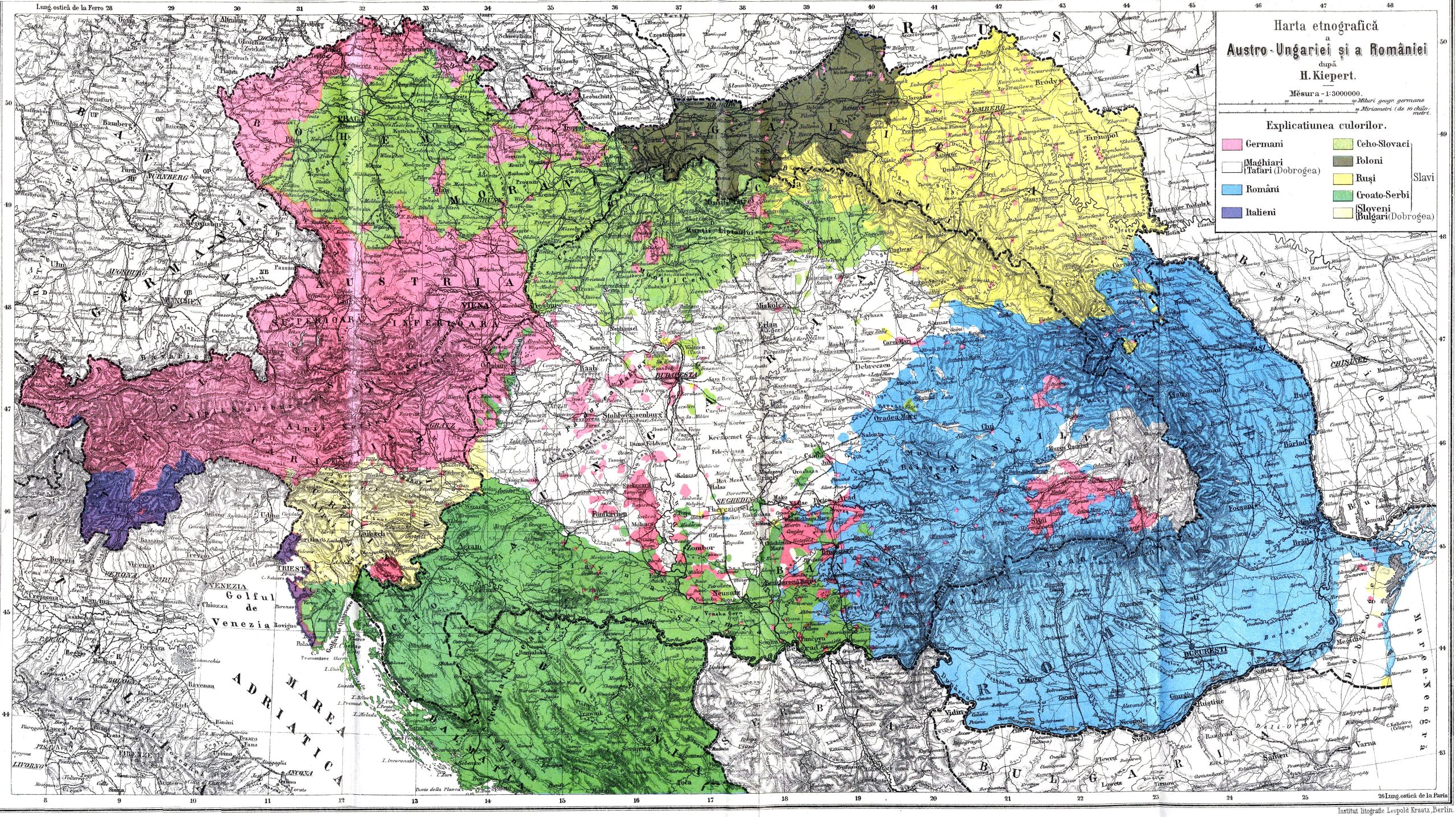 Этническая карта Австро-Венгрии — синяя область с румынским большинством