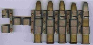Кусок рассыпной ленты пулемета Дарн 11 мм, с патронами Гра (11×59 R Gras)