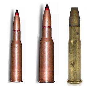 Слева патрон 7,62х54R, в центре альтернативный патрон 9,3х58R образца 1929 года, справа опытный альтернативный патрон 10,67х58R