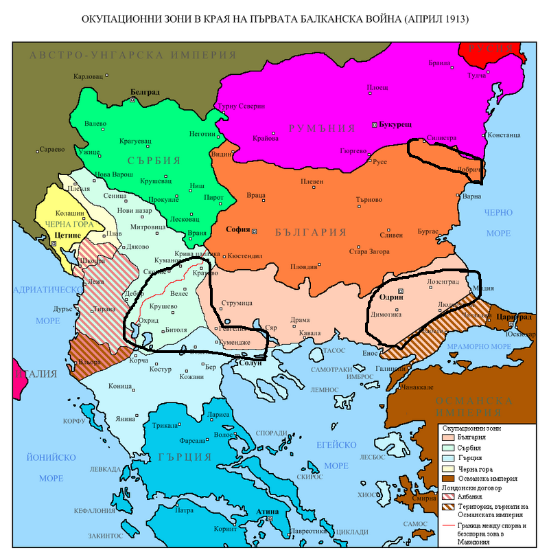 Балканы перед 2-й Балканской войной. Обведены районы территориальных конфликтов между Болгарией и её соседями — Македония, южная Добруджа и восточная Фракия