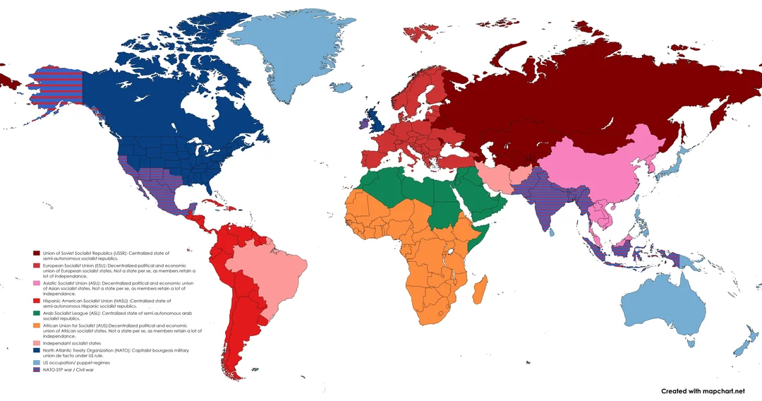 К середине 1960-х годов мировая карта стабилизировалась в виде двух конкурирующих систем. Обширная социалистическая сфера охватывала большую часть Евразии, Африки и Латинской Америки, образуя единое идеологическое и экономическое пространство. Советский Союз, отказавшись от роли оккупационной империи, стал идеологическим центром мирового социалистического порядка, построенного на принципах федерализма, деколонизации и скоординированного экономического планирования.