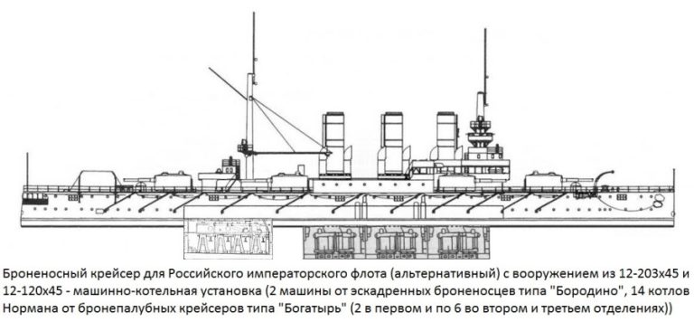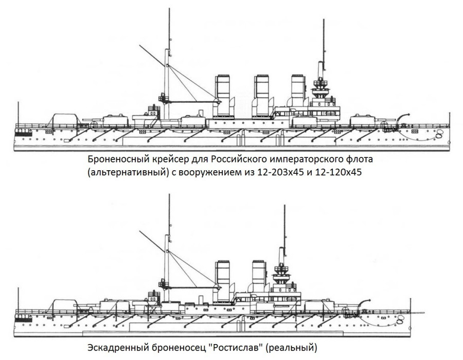«Ростислав» так и тянет порой переделать во что-то альтернативное — вроде вот такого броненосного крейсера с 12-203х45 и 12-120х45: