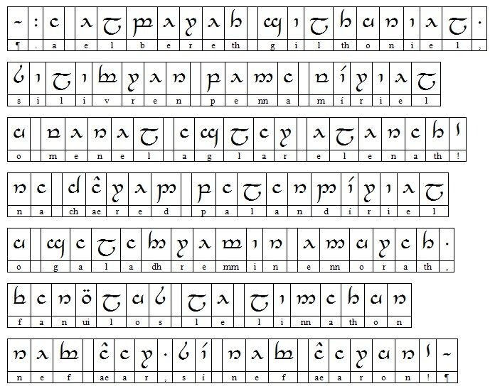 Тема чисто юмористическая, просьба продвинутым толкинистам, знающим страшные слова «синдарин», «квенья» «тенгвар» и т.д. в автора тапками не кидаться. Для удобства широких читательских масс в данном эссе используется абстрактный «эльфийский язык». Автор в курсе, что их было несколько разных, и все с любовью и заботой тщательно прописаны Профессором. Но в данном конкретном случае это значения не имеет, ведь для всех прочих рас Средиземья все эльфийские руны — как для нас китайские иероглифы.