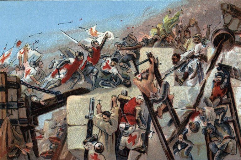Осадные башни подводят к стенам. Лучники подавляют защитников. В какой-то момент крестоносцам удаётся закрепиться на стене.