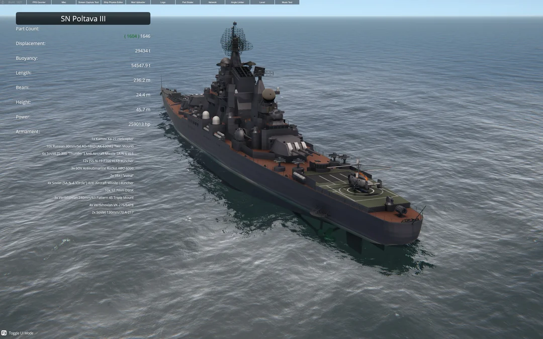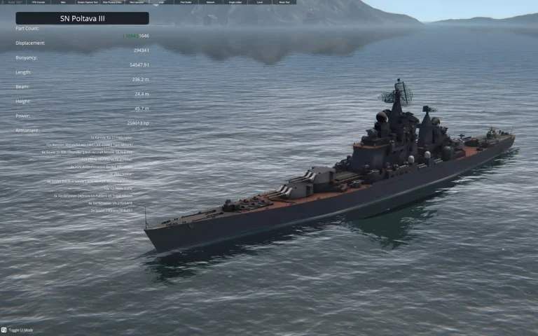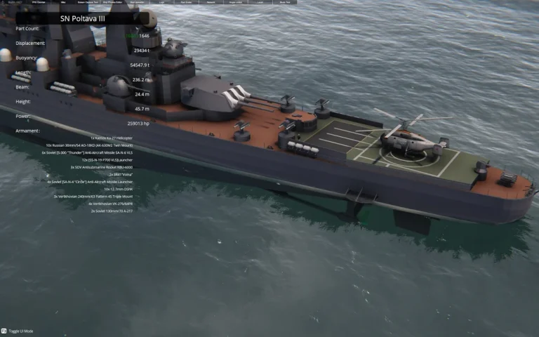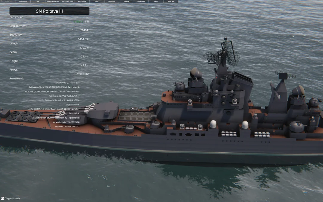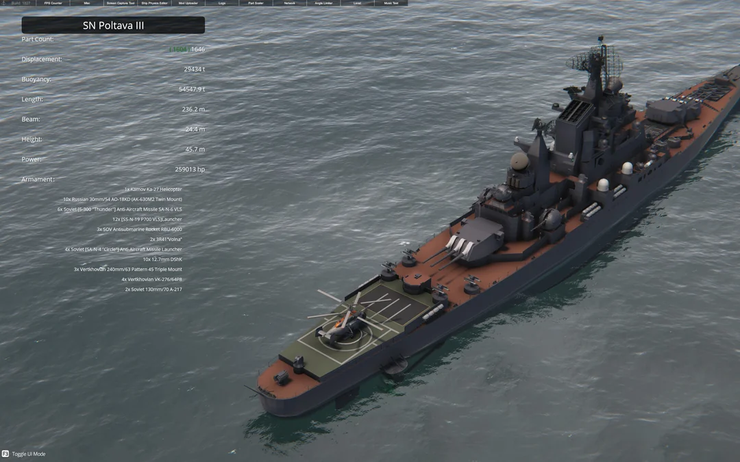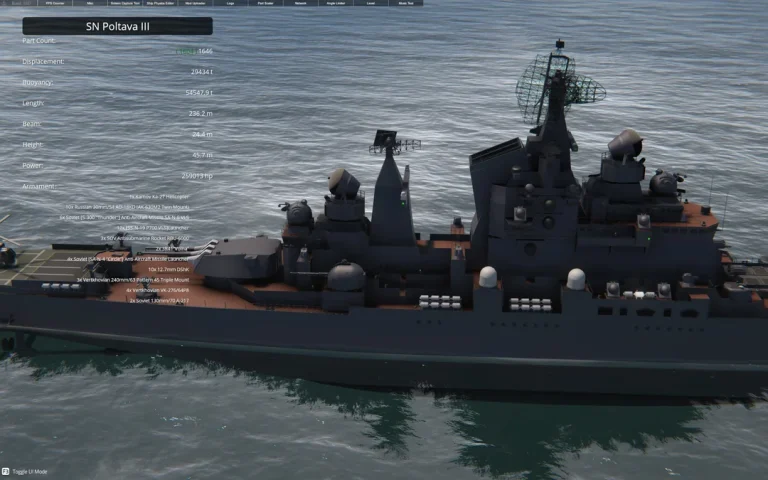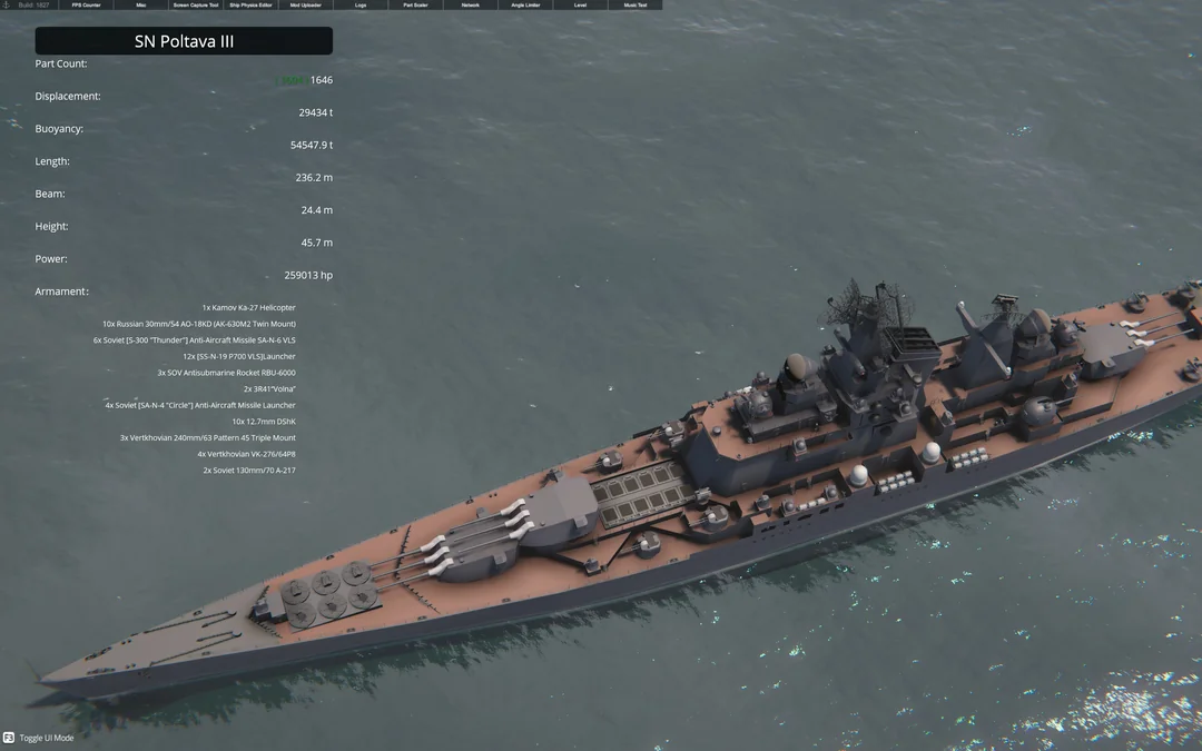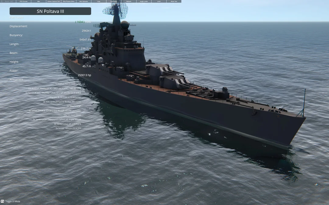 «Полтава» будет выведена в резерв в 2030 году и заменена на новый крейсер проекта 82-Н (новый): полностью электрическая двигательная установка, 240-мм орудия заменены на электромагнитные пушки (проект «Пересвет-М»), гиперзвуковые «Цирконы» (32 шт), лазерные комплексы «Пересвет» (4 шт), БПЛА и БПРК, водоизмещение 35,000 т.