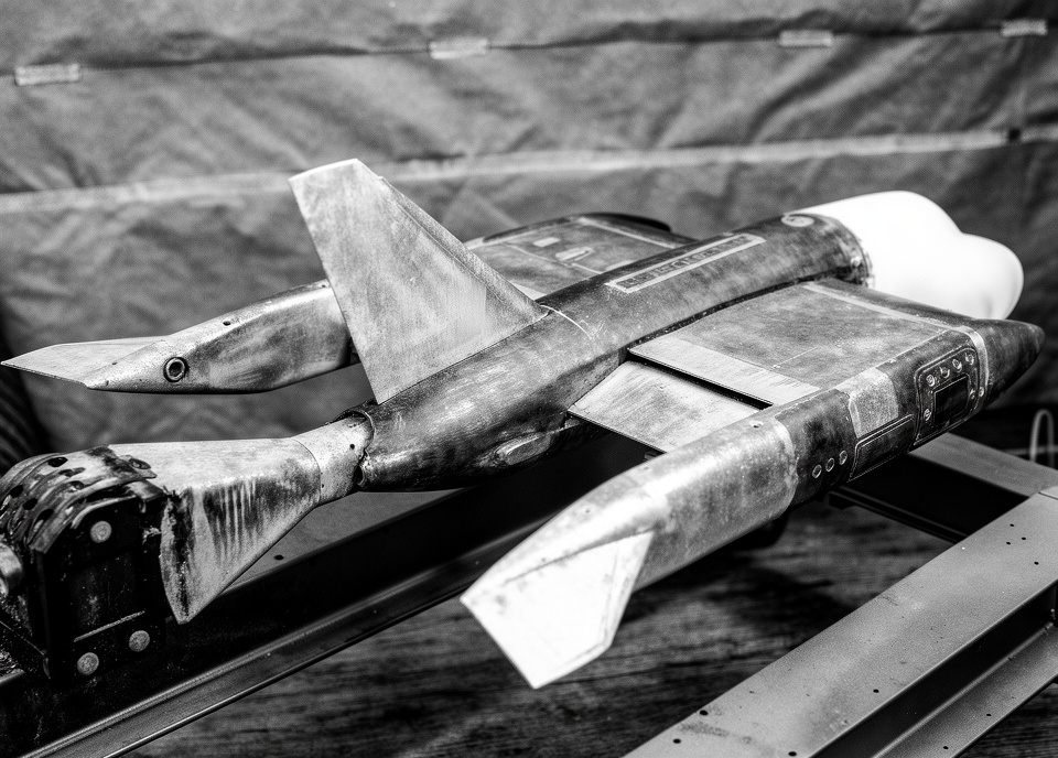 предназначенная для испытаний в аэродинамической трубе модель проекта Vought ADAM II, который был оснащен внешними горизонтальными стабилизаторами, установленными на коротких балках, выступающих назад из задней кромки крыла. Компания Vought предложила использовать систему ADAM для всех типов летательных аппаратов, от одноместных истребителей и штурмовиков до крупных военных и гражданских транспортных самолетов. Снимок НАСА. Изображение обработано сайтом lmarena.ai