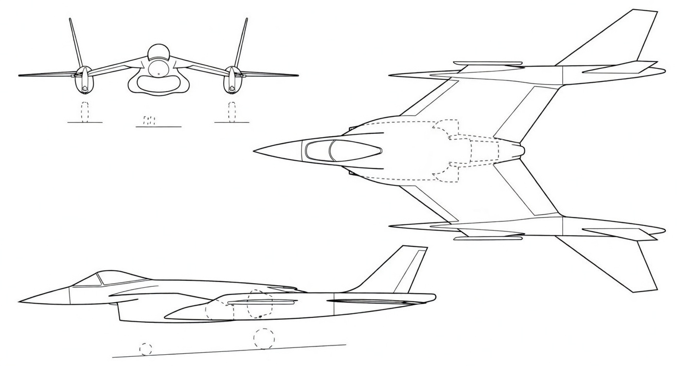 схема проекта истребителя British Aerospace P.1219. Внешнее хвостовое оперение было характерной чертой проектов семейства P.1219, разработанных British Aerospace в 1982 году. Однако целью этих проектных исследований было изучение методов снижения массы, а не внедрение передовых аэродинамических концепций. Рисунок Гая Инчболда © 2022. Изображение обработано сайтом lmarena.ai