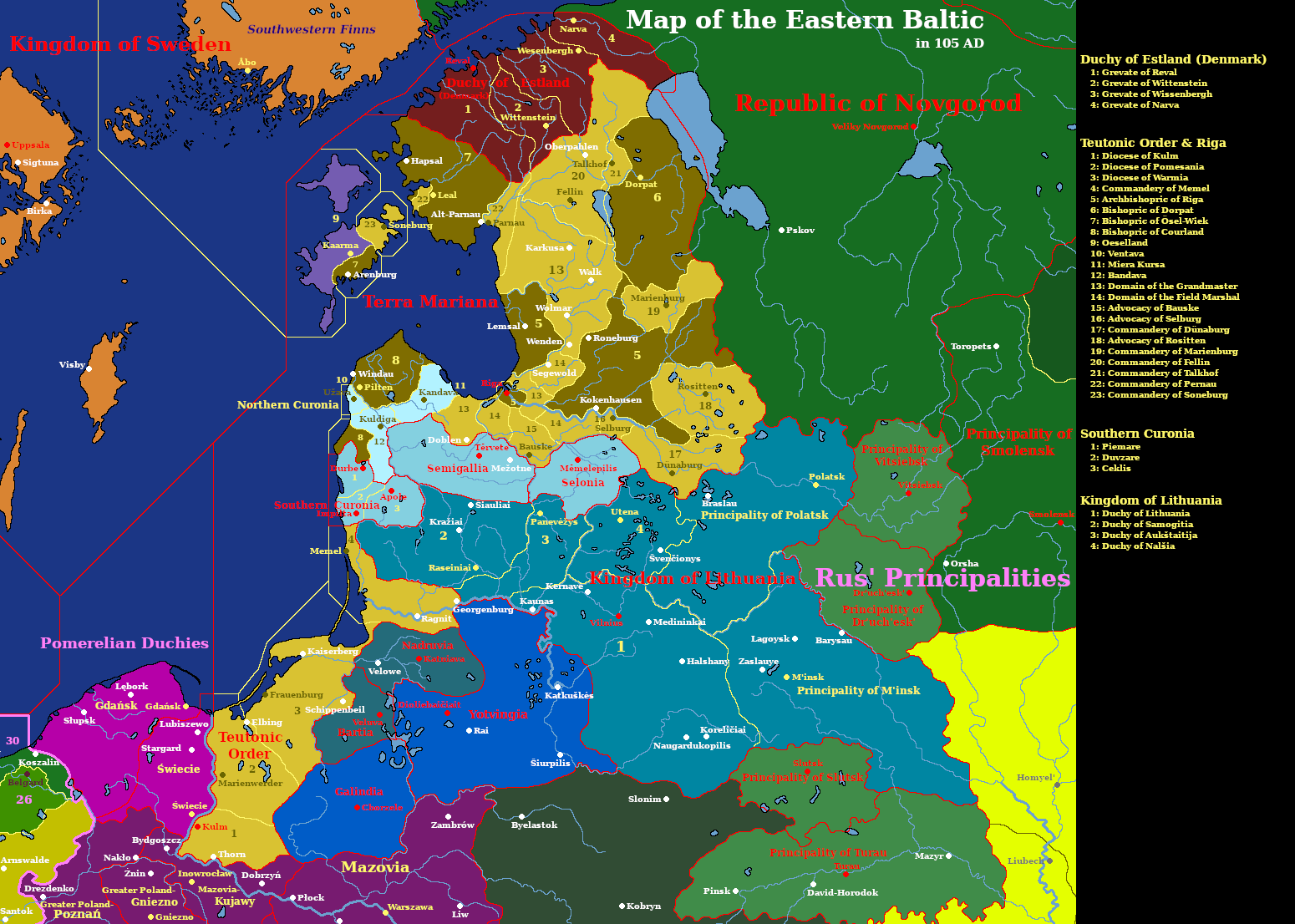 С богемской сталью в руках крестоносцы вторглись в Самбию и взяли её главную твердыню Твангсте. Жителей косили без жалости, пока немногие уцелевшие не бросились на восток, не склонив колен пред новой верой. На руинах старого городища вырос немецкий город. Замок в западном стиле, переселенцы с Рейна, новые законы. Твангсте переименовали в Кайзерберг в честь императора Оттокара, в надежде, что в грядущем году придёт больше меча и больше людей. Оттокар не прислал ничего. Но вместо него на помощь отозвался маркграф Бранденбурга, и скалвы пали одна за другой.