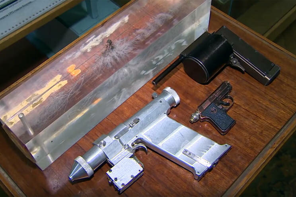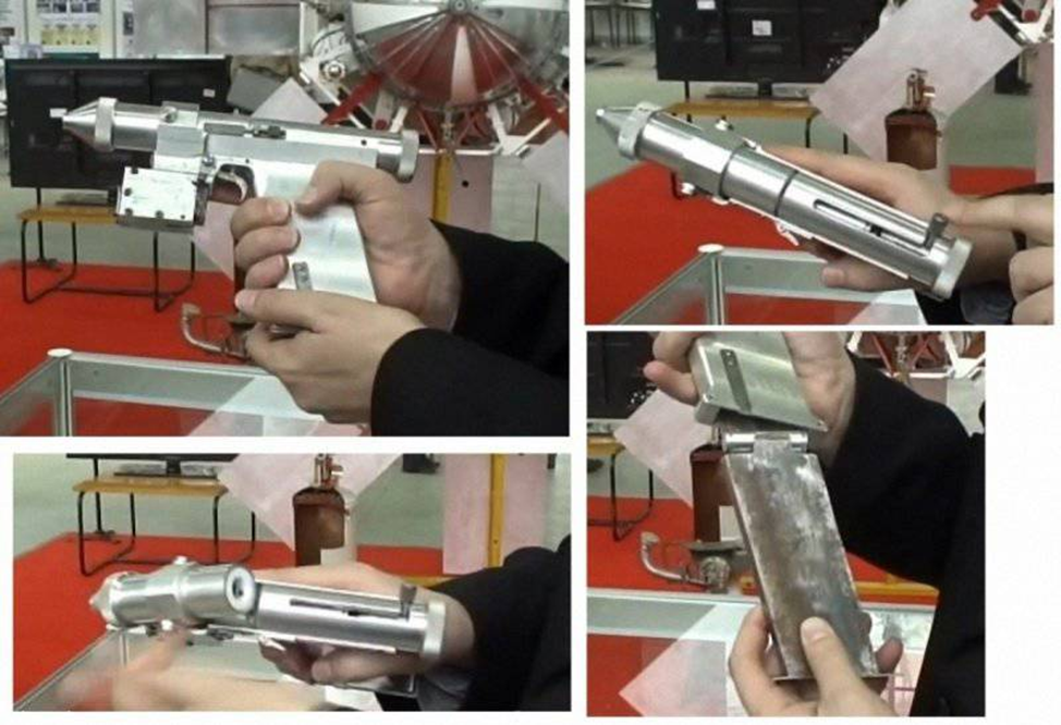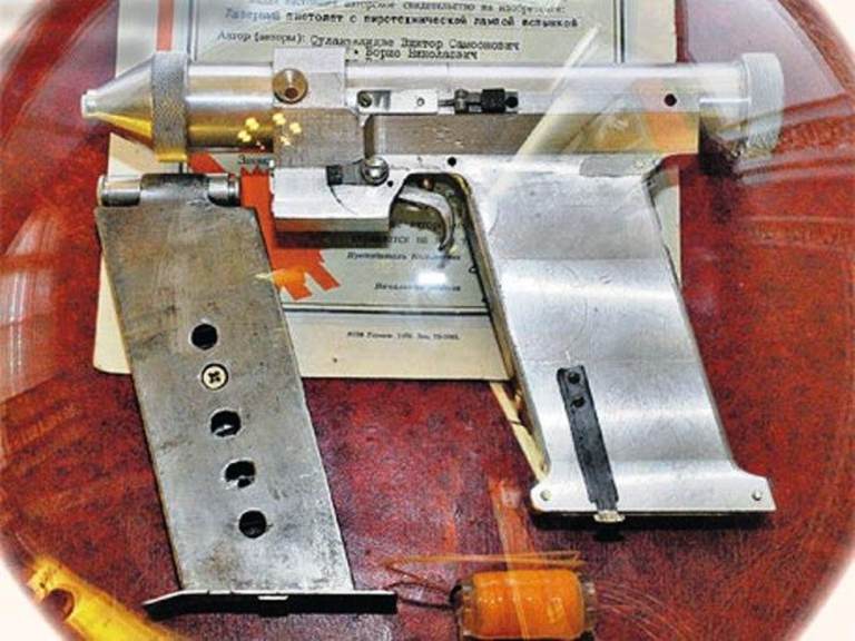 Начнем с экспериментального лазерного пистолета, разработанного для самообороны космонавтов. Оружие создано в 1984 году конструкторской группой Академии РВСН.