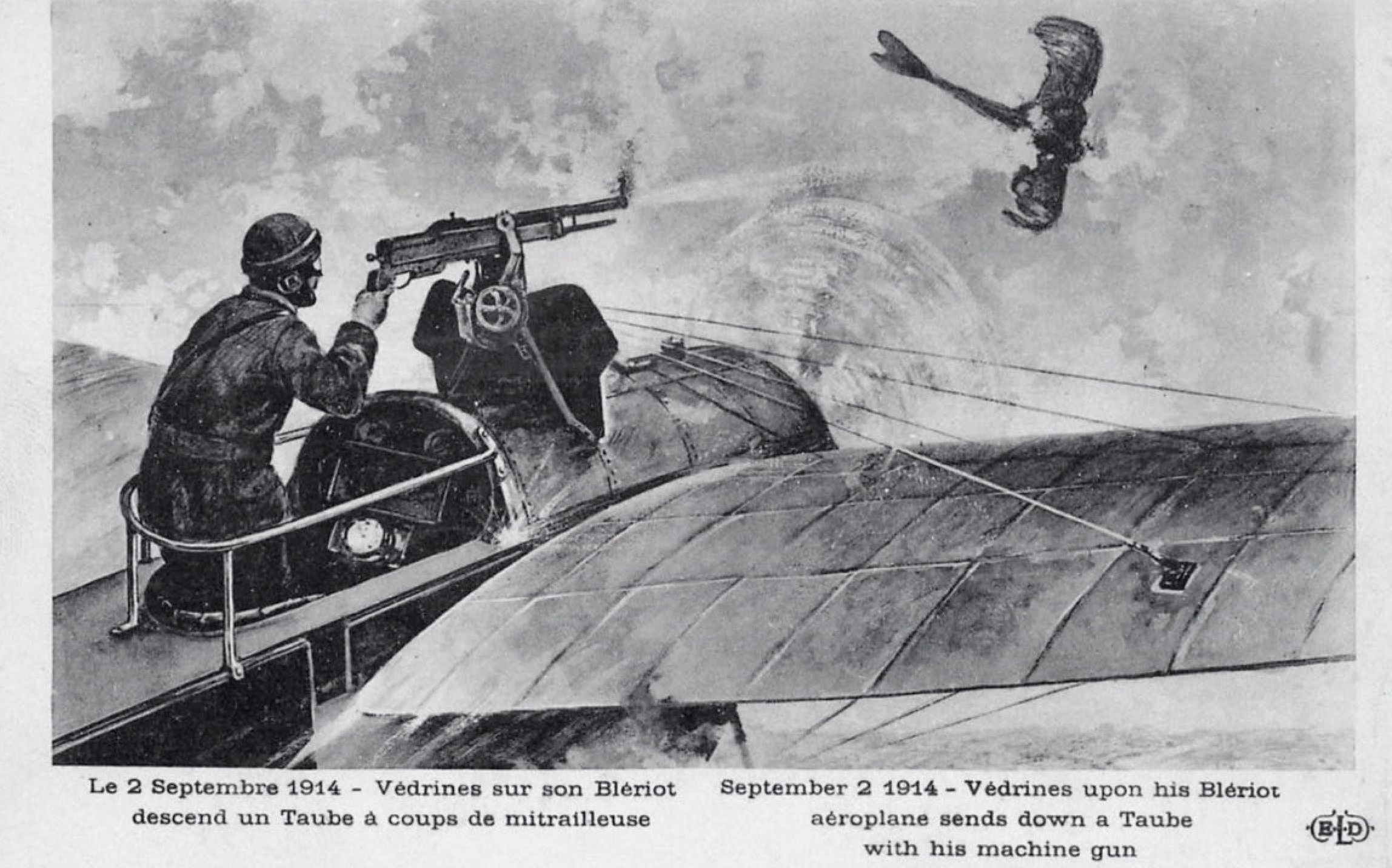«Сегодня утром, когда наша транспортная колонна покидала Сюипп, над нами пролетел немецкий самолет. Мы встретили его мощными залпами, которые попали в него, но не сбили. В этот момент Ведрин со своим 180-сильным «Блерио» бросился в погоню. Восемь минут длился поединок. Но Ведрин поднялся на высоту 2000 метров и пулеметным огнем сбил его. «Таубе» упал как камень, и вы можете представить нашу радость!»