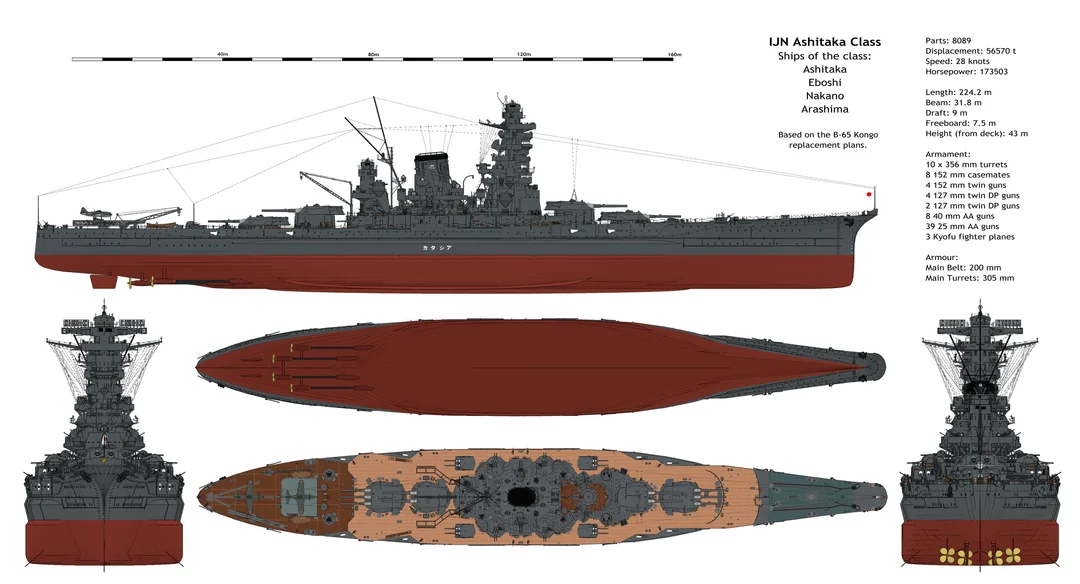 Это не просто корабль. Это символ эпохи, когда Япония, отвергнув догмы Вашингтонского договора, решила построить нечто большее, чем «Конго» — и нечто более быстрое и манёвренное, чем «Ямато». Результат — четыре гигантских, почти мифических корабля: «Ашитака», «Эбоси», «Накано» и «Арасима» — стали теми самыми «последними божествами моря», которые могли перевернуть ход Тихоокеанской войны.