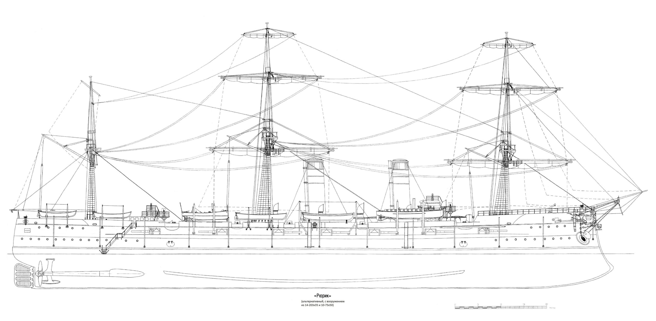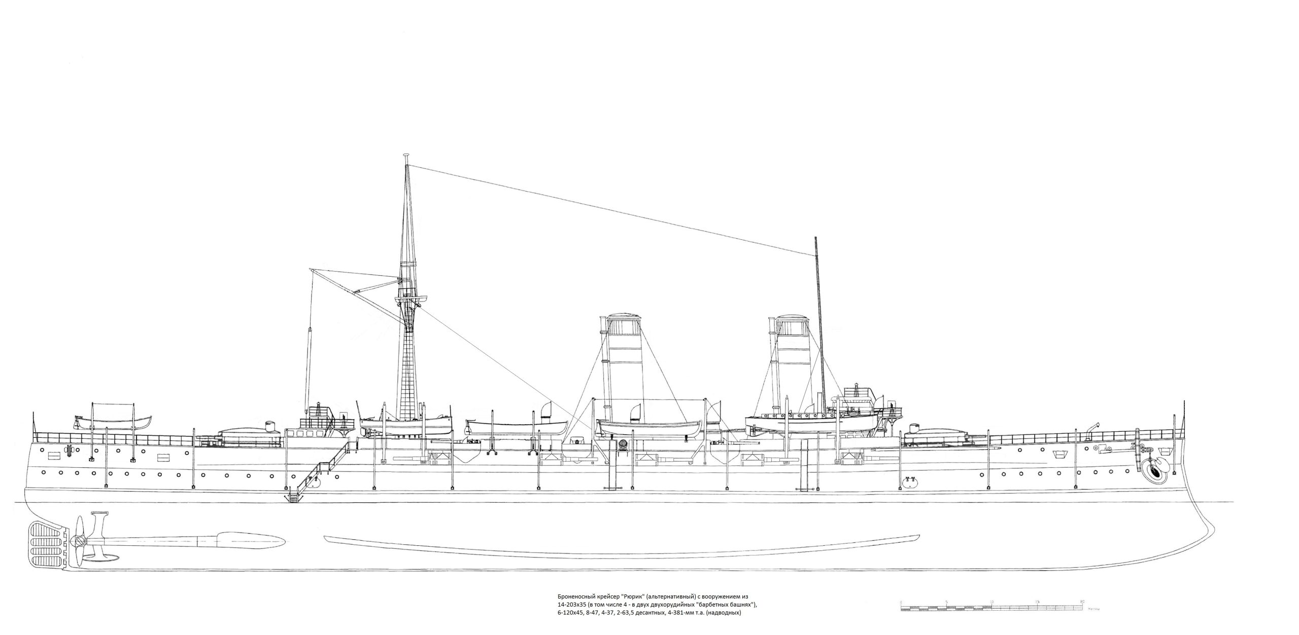 Главный калибр альтернативного «Рюрика» составили четырнадцать 203-мм/35 орудий образца 1889 года. Артиллерийская схема стала смелым гибридом казематно-башенного типа: