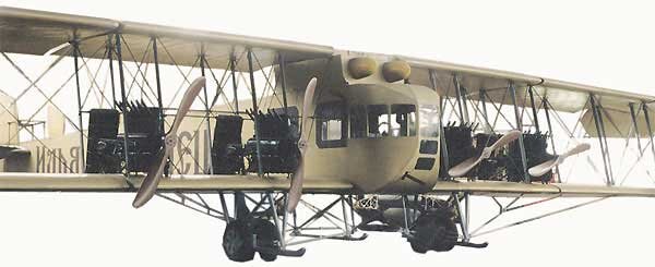 Этот самолет изначально проектировался под руководством И.И. Сикорского как военный, на нём предусматривались и бомбы, и пулумёты. Сикорский начал с двухмоторного биплана С-9 “Гранд”, поднявшегося в воздух в марте 1913г. В начале мая конструктор заменил одиночные мотоустановки тандемными и получился “Русский витязь”, который стал прототипом ещё большего воздушного корабля — “Илья Муромец” с размахом верхнего крыла 32 м. Это был гигантский по тому времени деревянный биплан. На нём предусматривалась площадка под пулемёт или 37-милиметровую пушку. “Муромец” взлетел 10 декабря 1913 года.