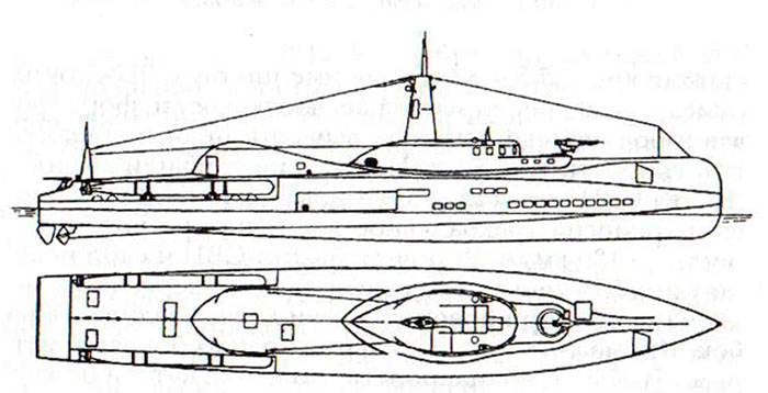 Однако многочисленная авиагруппа – это еще не все, потому что помимо самолетов большой крейсер «проекта «Х»» должен был комплектоваться двумя подводными лодками! Точнее, это были погружающиеся торпедные катера, разработанные в ЦКБС-1 под руководством Бжезинского В.Л. в 1934-1935 гг. Предлагалось два варианта: «Блоха-1» имела надводное водоизмещение 52 т, подводное – 92 т; «Блоха-2» — соответственно 35,3 и 74 т.