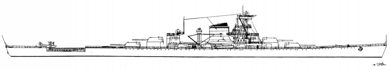 Попытка обеспечить большому крейсеру 38-узловую скорость имела и другие негативные последствия – чрезмерно длинный, но относительно узкий корпус не позволял обеспечить сколько-то серьезную противоторпедную защиту. С другой стороны, все же между машинными и котельными отделениями и бортом имелись «вставки» отсеков – хранилищ топлива, что до какой-то степени могло ослабить подрыв.