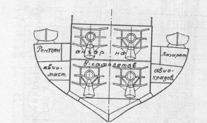 Для того чтобы обеспечить требование постоянного дежурства, понадобилось оснастить крейсер 9 (ДЕВЯТЬЮ) гидросамолетами, из которых восемь располагалось в ангаре внутри корпуса, а девятый – на единственной катапульте корабля. Но, как будто этого было мало, на верхней палубе предусматривалось место еще для двух-трех самолетов, то есть общая численность авиагруппы могла достигать двенадцати машин!
