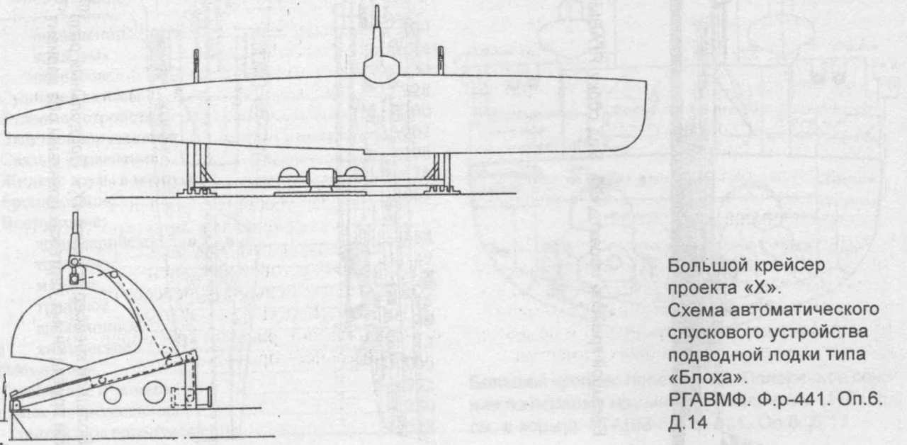 Проектанты не определились, где именно следовало размещать подводные лодки, предлагалось два варианта – в корме (на представленных выше автоматических спусковых устройствах) или же в середине корпуса вместе со шлюпками