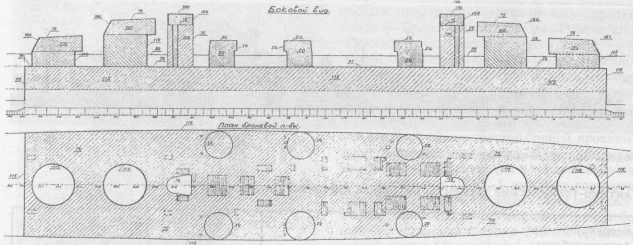 Лобовая плита башен главного калибра должна была составить 150 мм, боковые стенки – 100 мм, крыша – 75 мм, барбеты – 115 мм. Башни и барбеты универсального калибра защищались 50 мм броней.