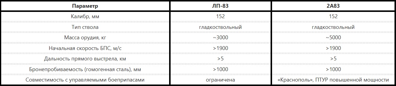 Сравнительный анализ технических характеристик орудий ЛП-83 и 2А83