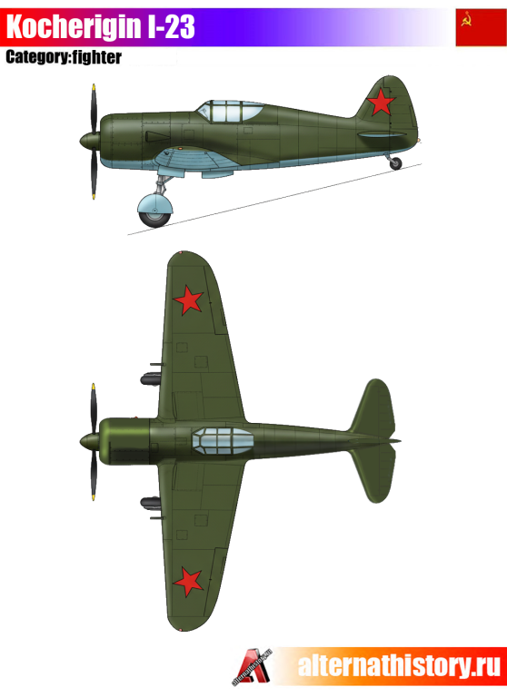 Ещё до войны Кочеригин попробовал развивать линию истребителя с однорядной звездой, видимо надеясь в скором времени получить более мощные двигатели М-64 и М-65. Как известно, двигатели эти не удались (впрочем, возможно, ими просто не занимались, решив развивать более перспективные двойные звёзды). И всё же, крайне любопытный вариант И-23 был не просто создан и испытан, но и строился малой серией…