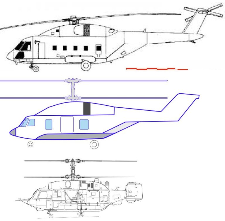 - Схема: вертолёт спроектирован по традиционной для ОКБ Камова соосной схеме.
