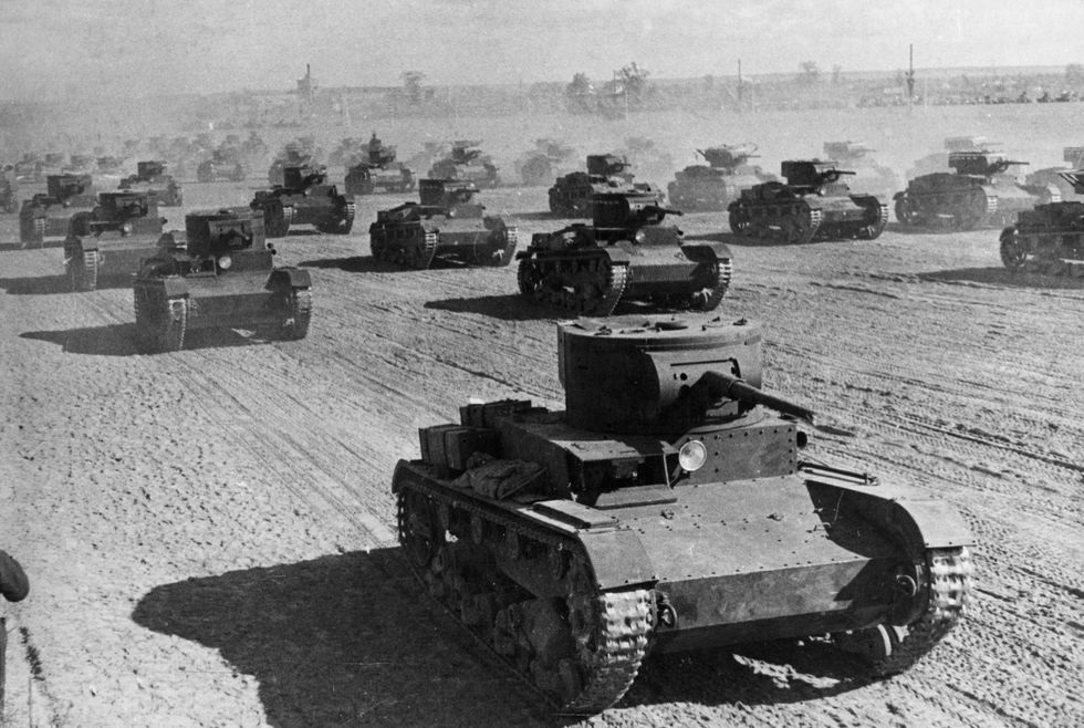 В РККА в те времена также создавались танковые бригады. Но опыт боевых действий в Монголии и Финляндии показал совершенно неудовлетворительное взаимодействие с пехотой. На фото – советская танковя бригада на учениях. Где пехота?