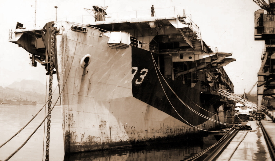 Авианосцу «Тэйн» больше не довелось вернуться на службу. На этом фото он уже с демонтированным вооружением и оборудованием, в ожидании разделки на металл